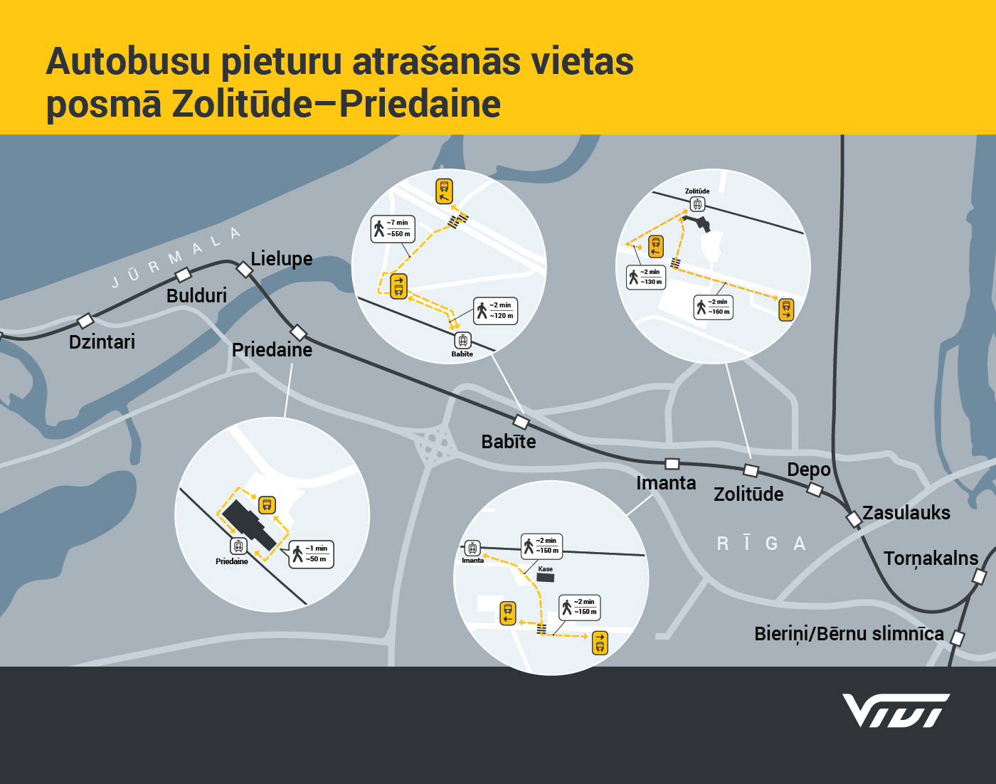 Pieturas saglabāsies tajās pašās vietās, kur tās bija izvietotas iepriekšējos būvdarbu posmos. Autobusa pieturas Zolitūdē un Imantā abos virzienos abās stacijās atradīsies esošajās pilsētas autobusa pieturvietās Rostokas ielā, savukārt Babītē – autobusi virzienā uz Rīgu izmantos esošo pieturu “Babītes stacija”, bet virzienā uz Sloku autobusu pieturu “Rododendru audzētava” uz autoceļa A5 Rīgas apvedceļš. Priedainē, Tukums I un Tukums II pietura atradīsies pie stacijas ēkas.