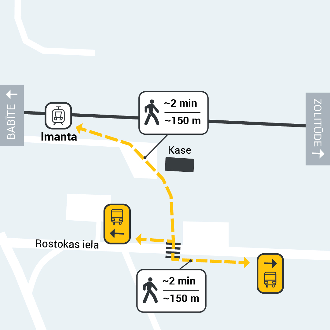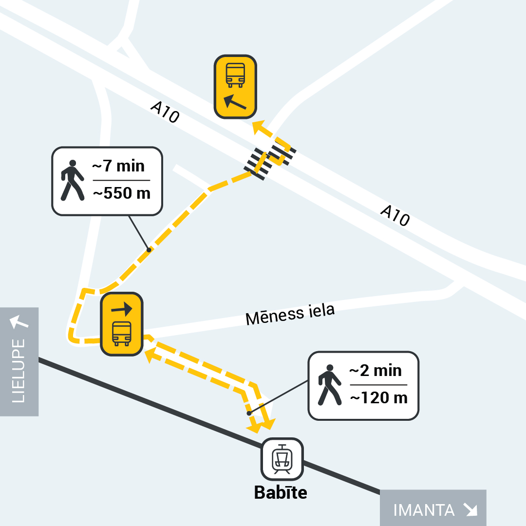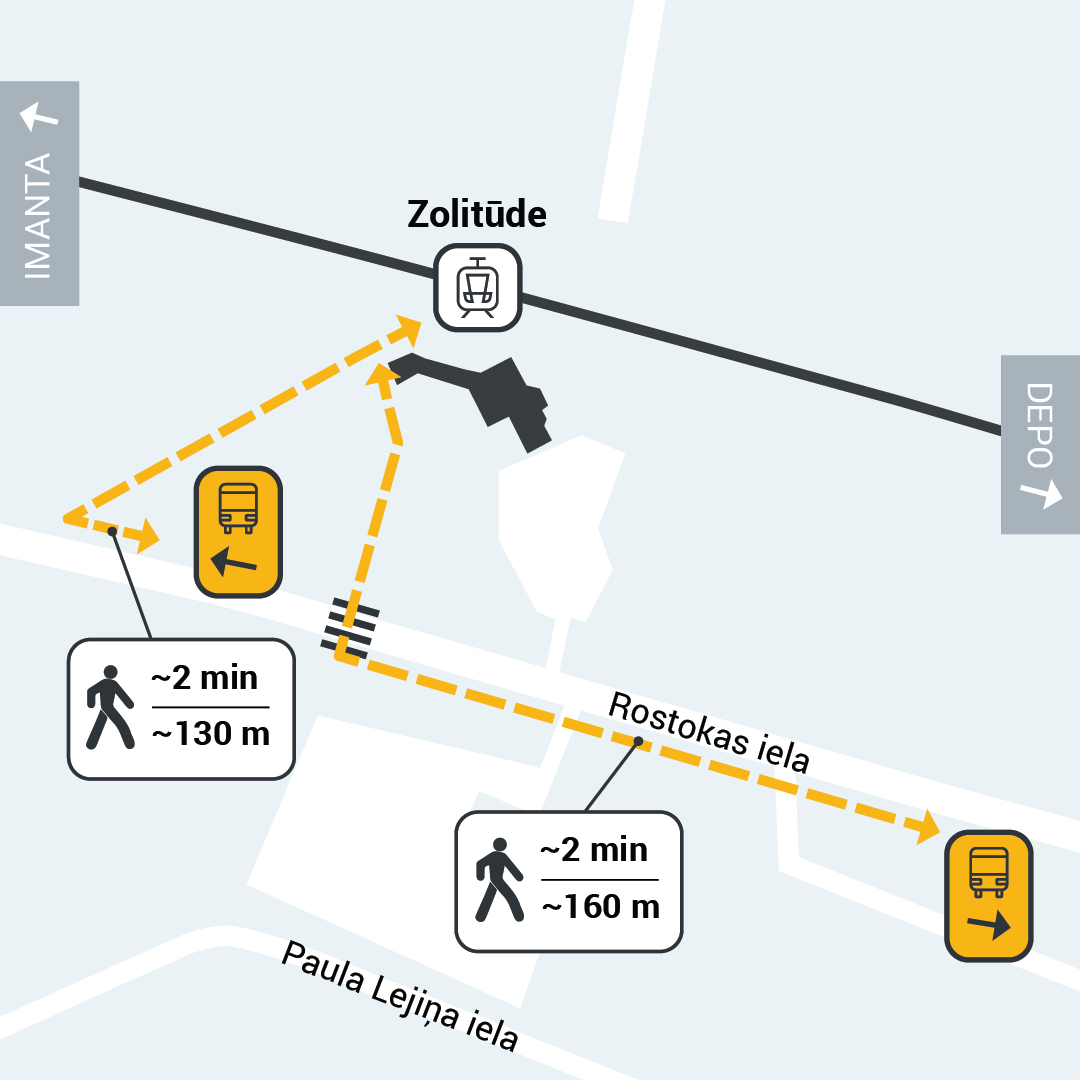 Pasažieri pārsēsties no vilciena uz autobusu varēs kā Imantā, tā Zolitūdē. Taču katrā pieturā tikai vienā virzienā pārsēšanās būs ērtāka, jo tajās autobusu un vilcienu reisi būs salāgoti. Slokas virzienā pasažieriem ērta pārsēšanās no vilcieniem uz autobusiem būs nodrošināta Zolitūdē, savukārt no autobusiem uz vilcieniem Rīgas virzienā – Imantā.