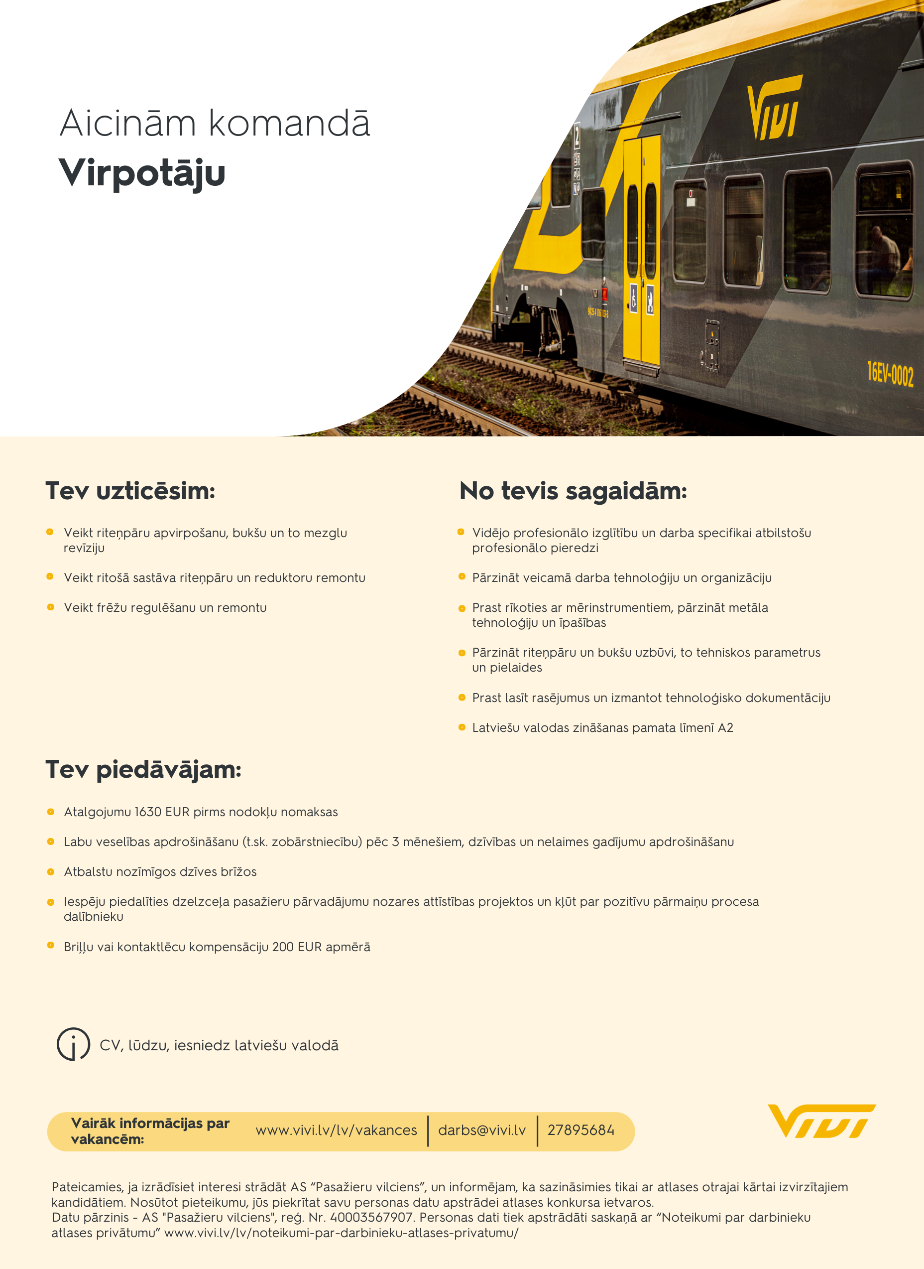Pateicamies, ja izrādīsiet interesi strādāt AS "Pasažieru vilciens", un informējam, ka sazināsimies tikai ar atlases otrajai kārtai izvirzītajiem kandidātiem.