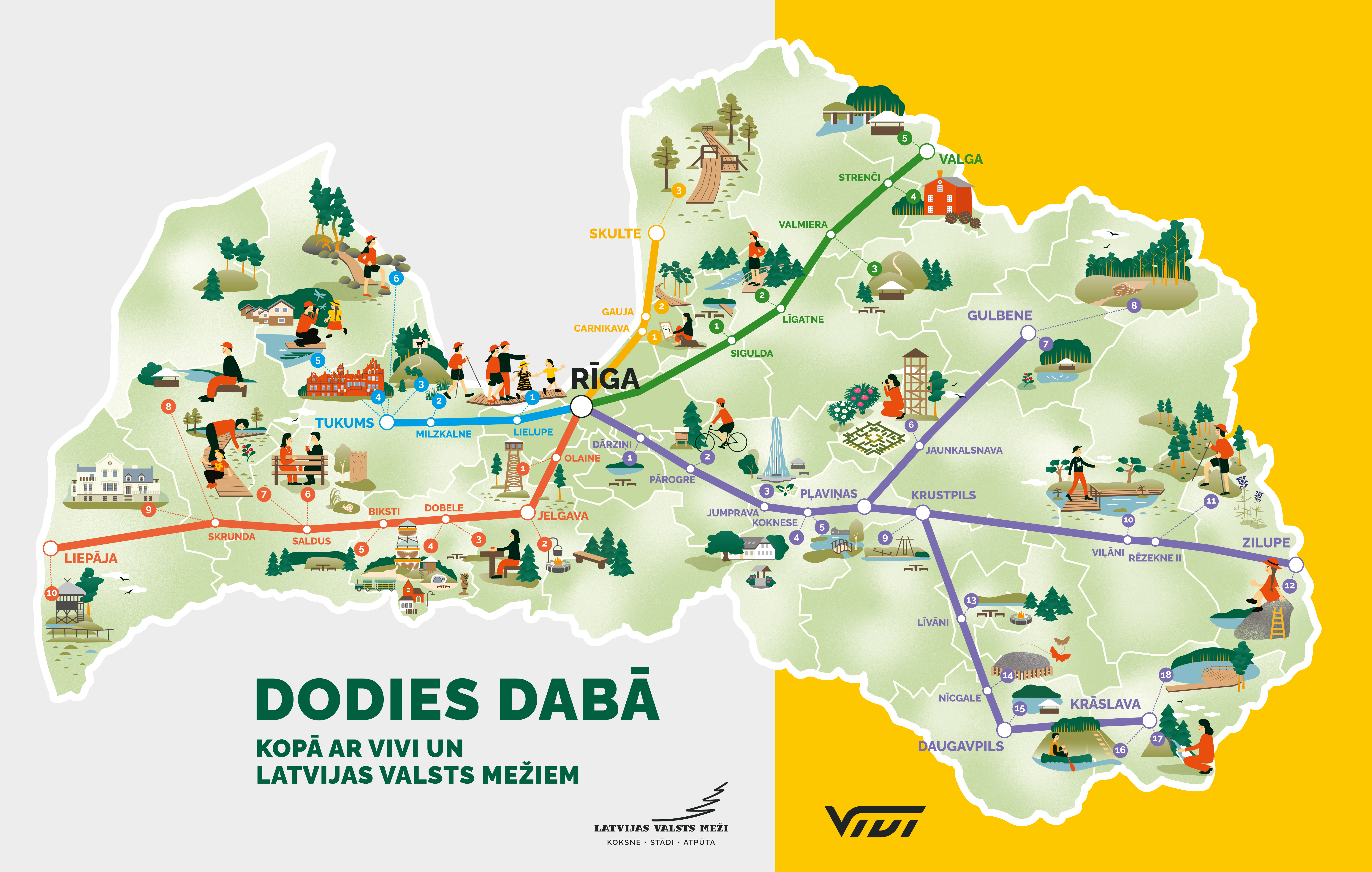"Latvijas valsts meži" visā Latvijā uztur vairāk nekā 300 bezmaksas atpūtas vietas – dabas takas, skatu torņus, velo maršrutus un labiekārtotas atpūtas zonas, un liela daļa šo vietu ir ērti sasniedzamas ar vilcienu. Tāpēc ir izveidota īpaša, interaktīva karte un ceļvedis, kas palīdz plānot gan īsus izbraucienus, gan aktīvus dabas piedzīvojumus. Apskatīt karti →