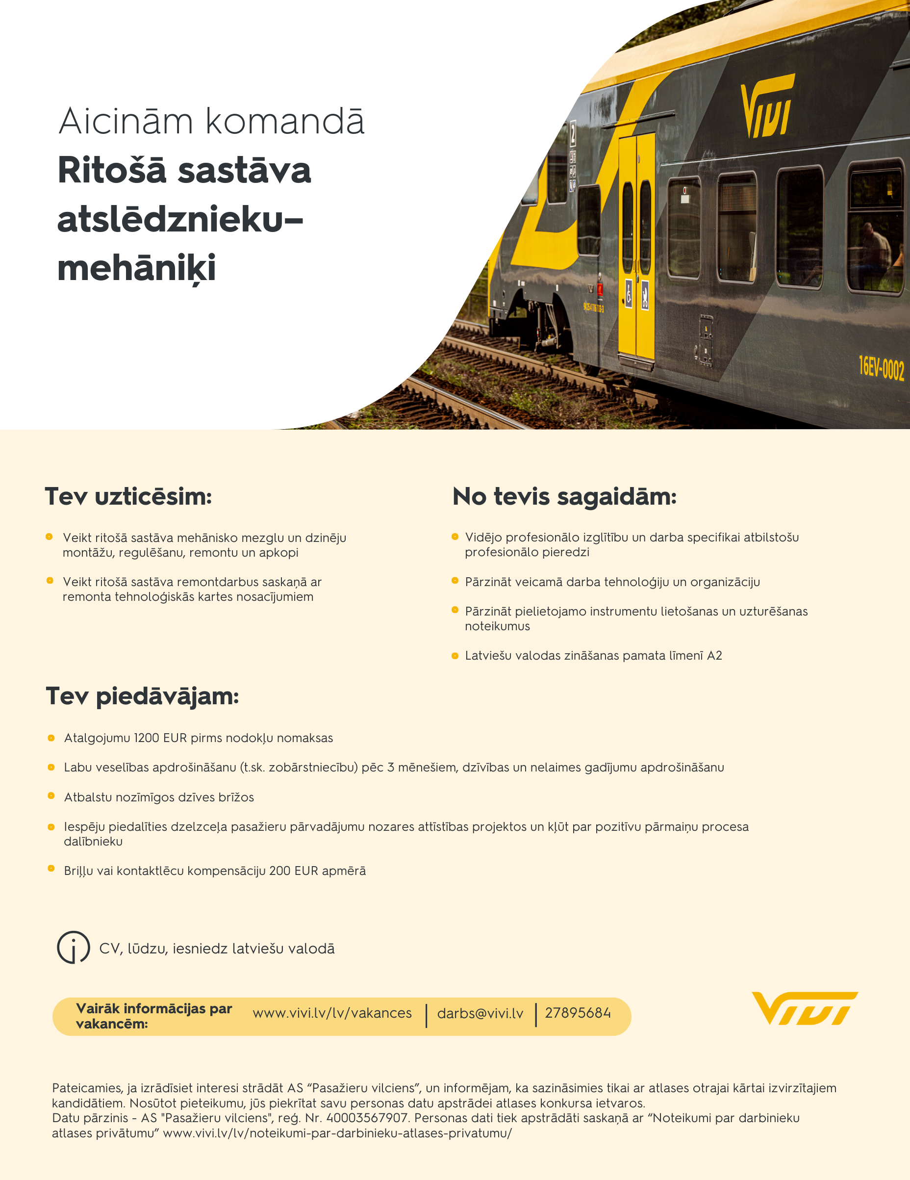 Pateicamies, ja izrādīsiet interesi strādāt AS "Pasažieru vilciens", un informējam, ka sazināsimies tikai ar atlases otrajai kārtai izvirzītajiem kandidātiem.