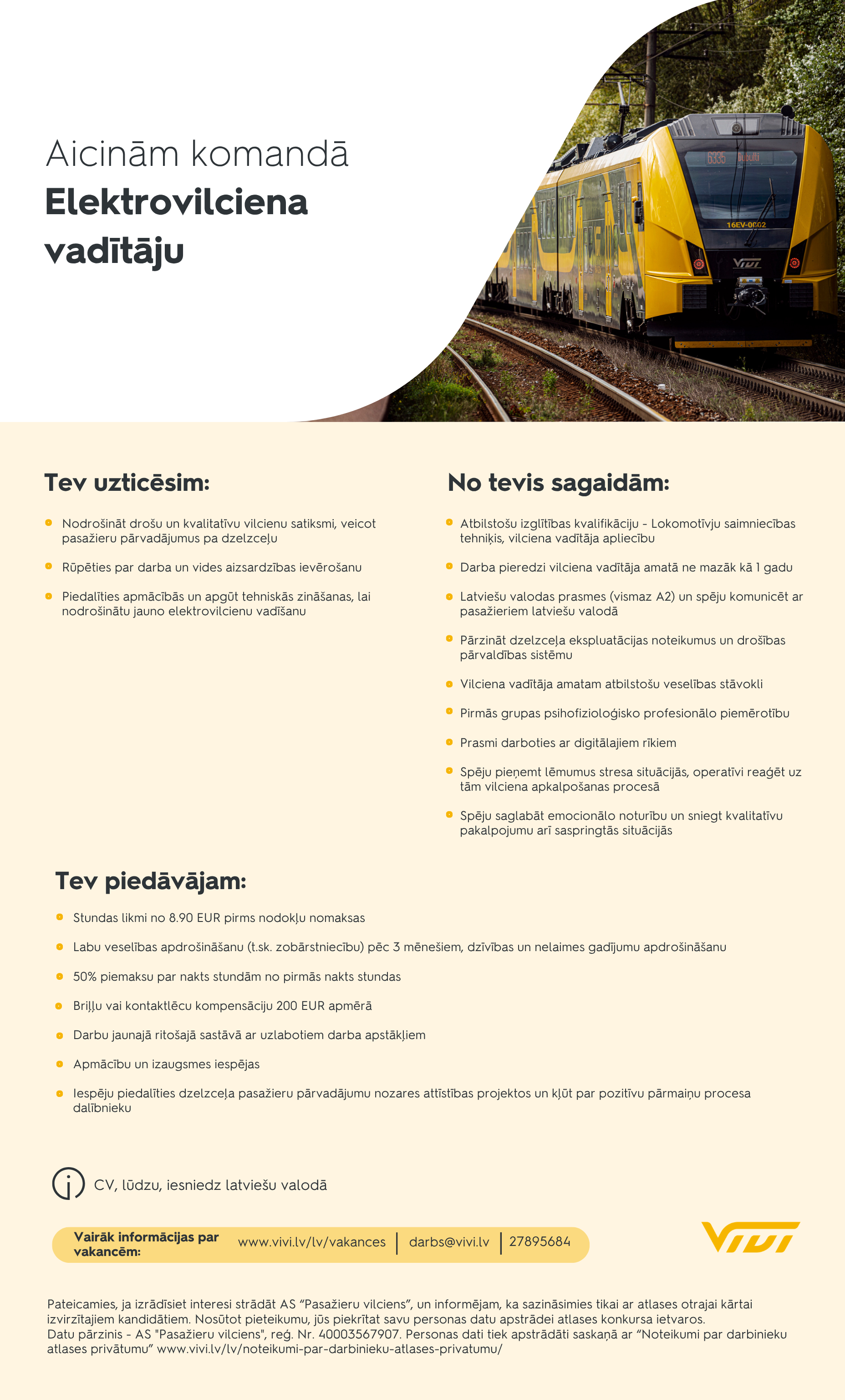 Pateicamies, ja izrādīsiet interesi strādāt AS "Pasažieru vilciens", un informējam, ka sazināsimies tikai ar atlases otrajai kārtai izvirzītajiem kandidātiem.